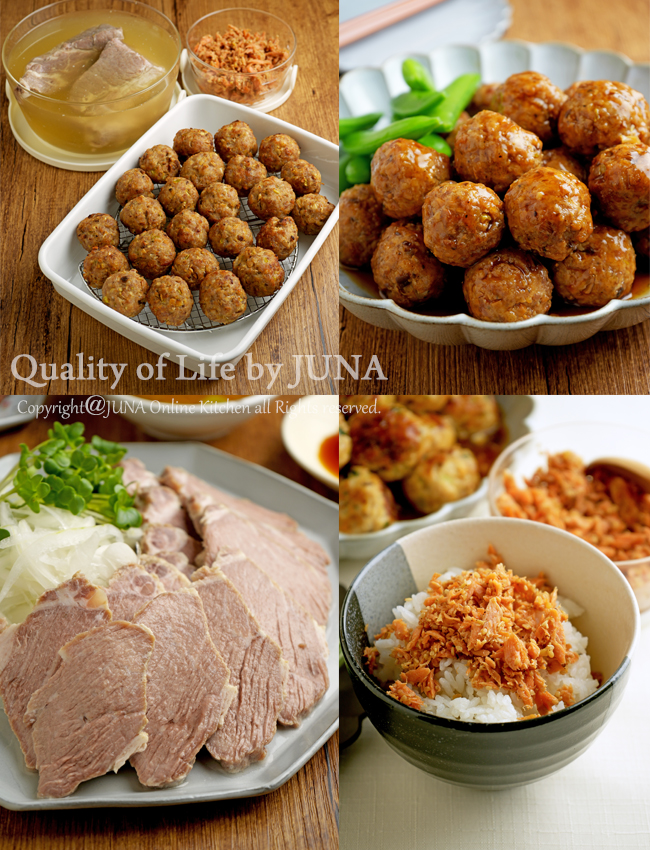 「メインおかずの作りおき」として塩煮豚、ストック肉団子、自家製鮭フレークを作りましょう